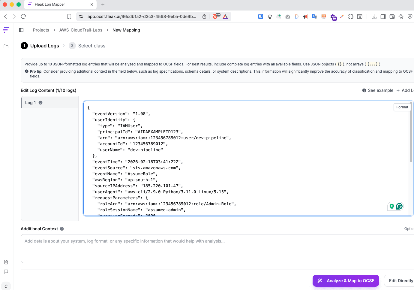 The tool is available for free at app.ocsf.fleak.ai. No credit card, no enterprise negotiation required.