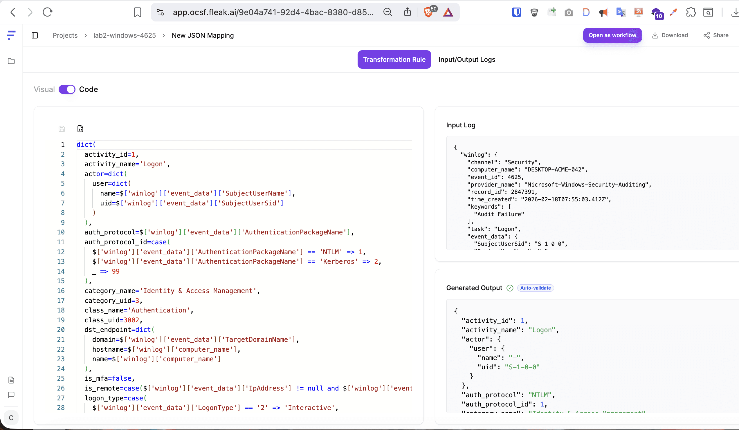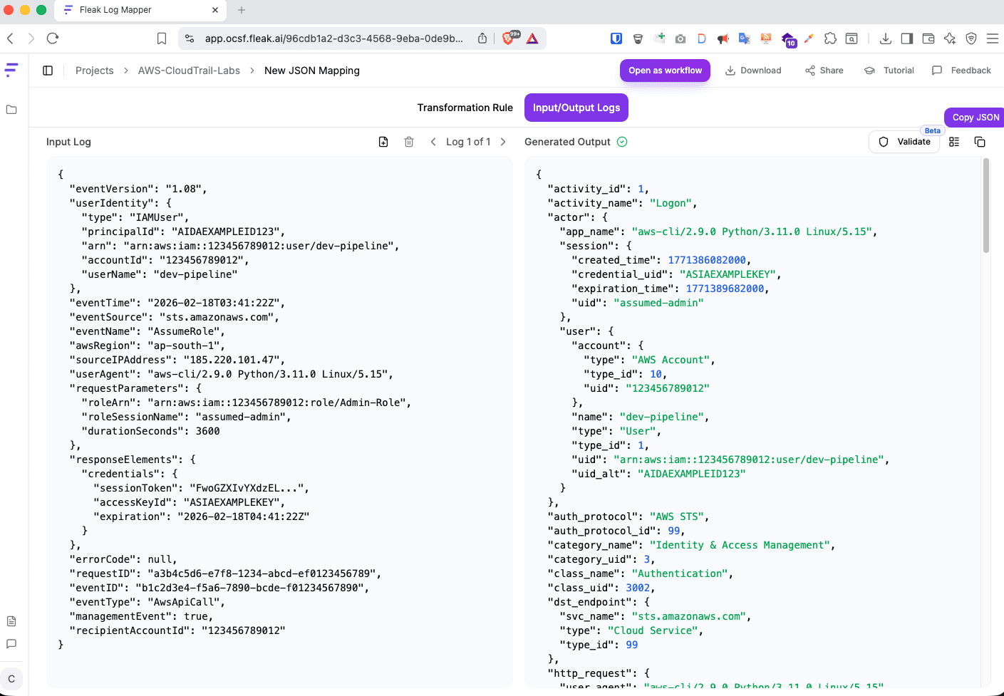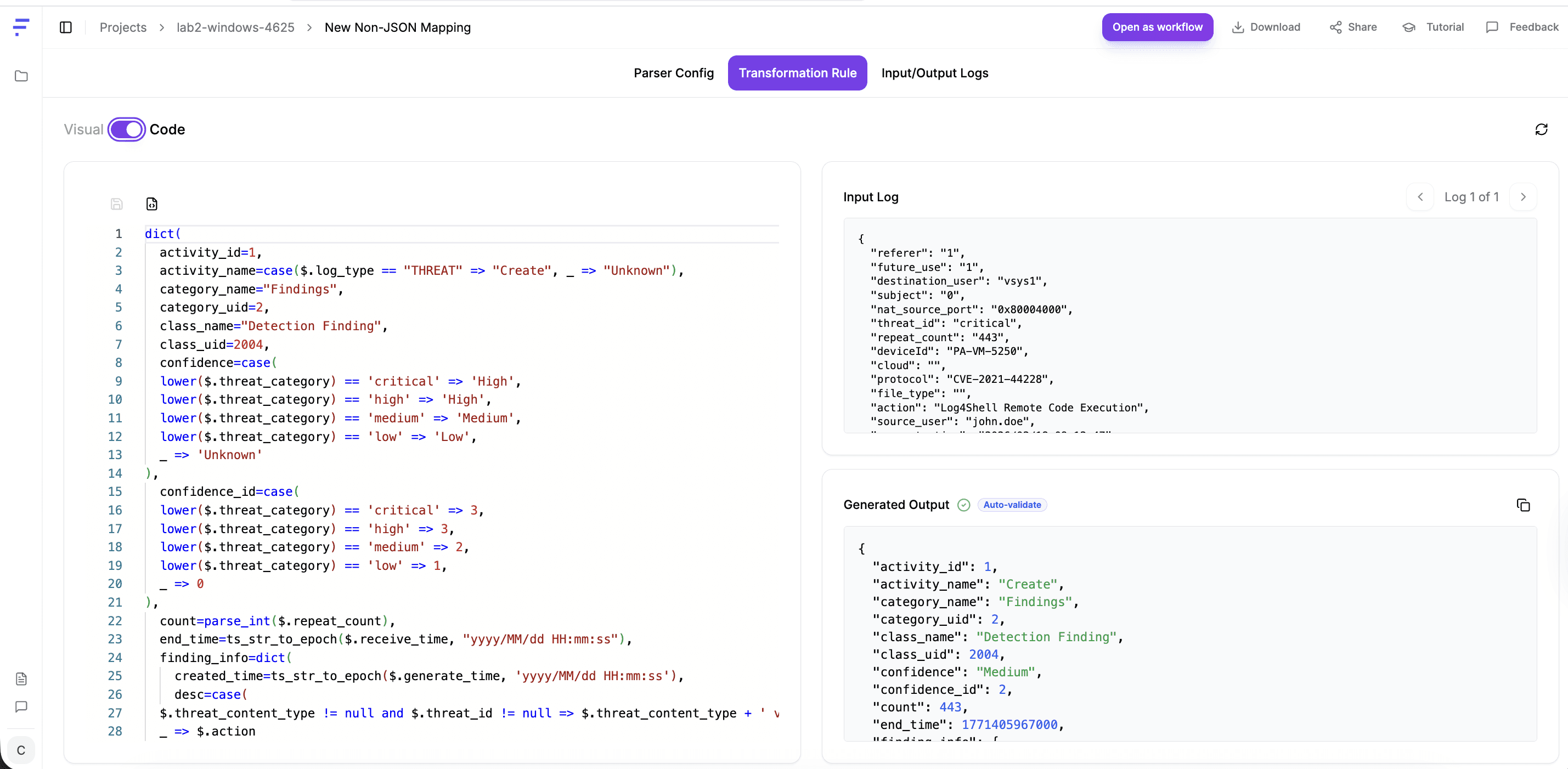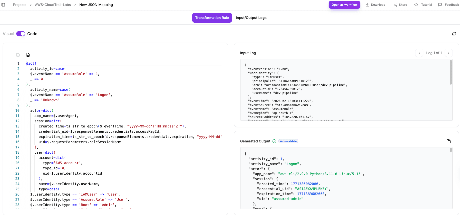 For Security Operations: The decoupling of mapping design from mapping execution is genuinely smart architecture. It means your security engineers can author and test OCSF configurations in a safe, web-based environment without ever touching your production log pipeline. This maps well to a GitOps or change management workflow.