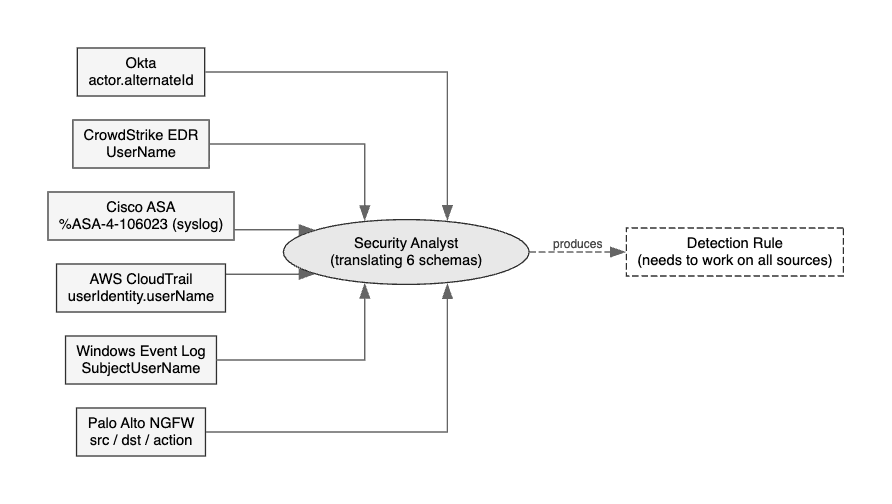 The following diagram shows the core problem. The same authentication failure event, fragmented across six common enterprise security tools, each naming fields differently - all pointing to one overwhelmed analyst who needs to produce a single detection rule: