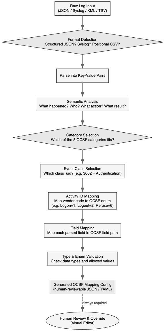The diagram below shows the internal decision flow of the AI when it receives a raw log and needs to produce an OCSF mapping: