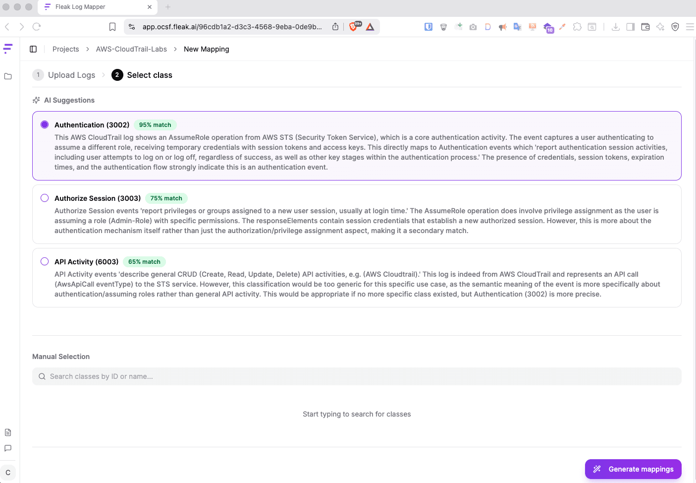 The pitch is clean: you bring your raw, vendor-specific logs, and the tool uses AI to generate OCSF-compliant mapping configurations. You do not need to be an OCSF expert. You do not need to manually look up category UIDs or stitch together transformation scripts.