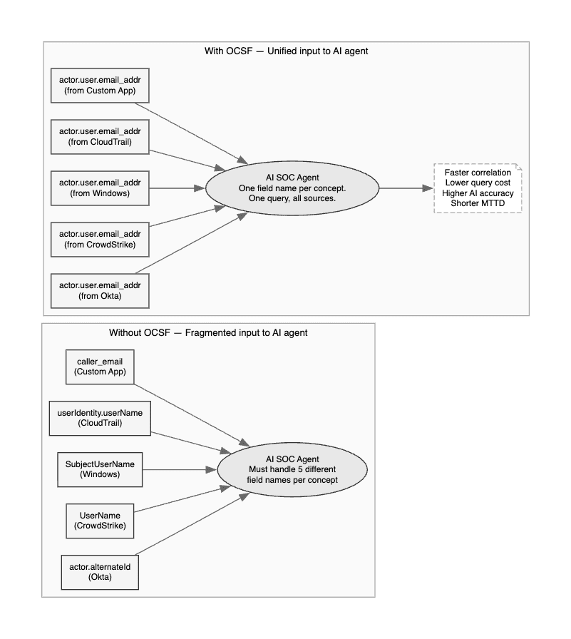 The diagram below illustrates exactly what the data layer looks like before and after OCSF normalisation - and why this matters so much for AI model accuracy: