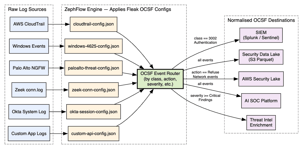 The diagram below shows a production-grade ZephFlow deployment processing all six of our lab log sources simultaneously, routing normalised OCSF events to different downstream platforms: