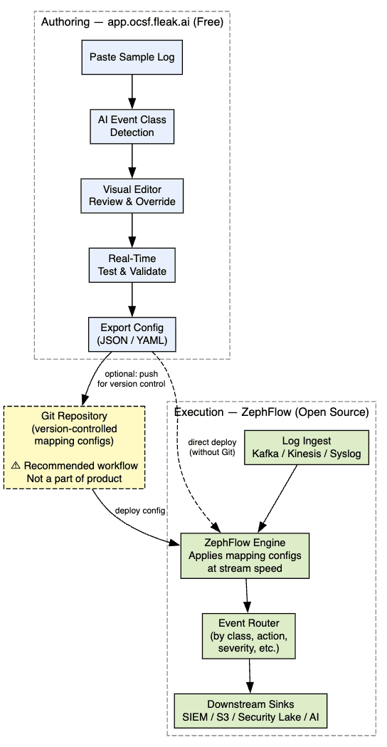 The OCSF Mapper is where you design and test your transformations - purely a design tool, nothing runs live. ZephFlow is the execution engine that processes your live log streams using the exported configuration files. The configurations are portable and can be deployed in your own infrastructure.