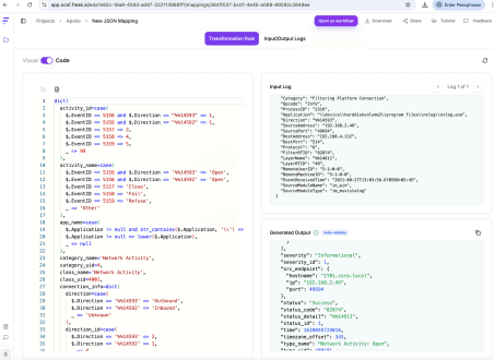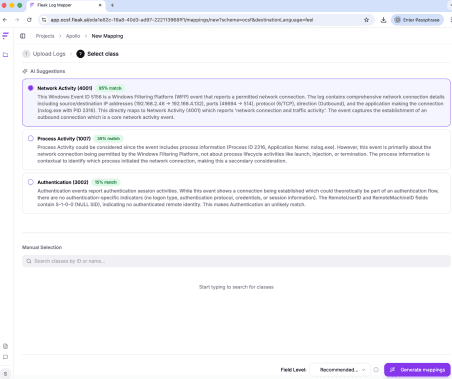 ● Mapping that doesn't require a PhD. Instead of writing parsers by hand, the system analyzes sample logs and generates transformation logic for you. Setup goes from months to weeks or hours.